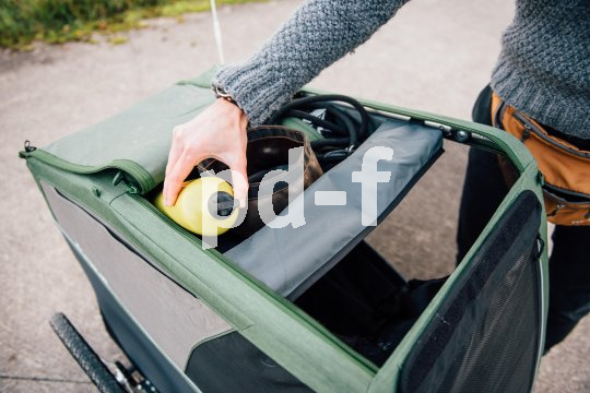 | Bildunterschrift: | Gute Idee: Unter dem Dach des Hundeanhängers ist noch ein Fach für die notwendigen Utensilien von Leine bis Leckerli. |