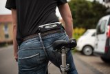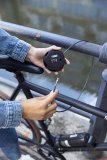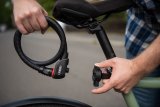 Eine Frau schließt ein Fahrrad mit einem Schloss an einem Fahrradparker an