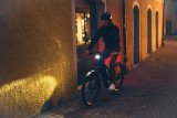 Paar fährt auf Fahrrädern nebeneinander durch die Stadt.