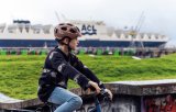 Ein Mädchen und ein kleinerer Junge fahren auf Fahrrädern. Das Mädchen lächelt dem Jungen zu und hat eine Hand auf seiner Schulter, um ihn zu unterstützen.