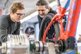 Ein Mann hantiert in einer Werkstatt an einem Kabel, dass an einem E-Bike angeschlossen ist.
