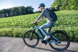 Ansicht des Bereiches um den Motor eines E-Bikes während der Fahrt.