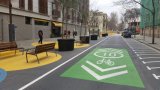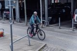 Ein Lastenradfahrer überquert eine Straße innerhalb einer Fahrbahnmarkierung. Ein Auto wartet im Hintergrund.