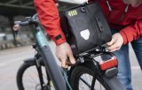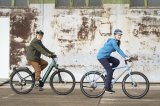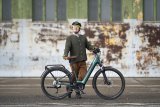 Ein Kind mit buntem Helm fährt mit einem Fahrrad über einen Platz.