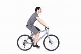 Eine Person sitzt in einem Fahrradladen auf einem Ergometer. Eine zweite Person schaut von der Seite darauf.