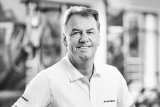 Ein Mann steht neben einem E-Bike in einem Montageständer. In der Hand hält er einen Laptop, der über Kabeln mit dem Rad verbunden ist.