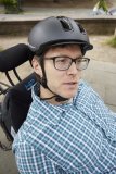 Ein Mann mit Fahrradhelm fährt ein dreirädriges Liegerad auf einem Parplatz.