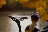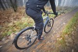 Die rechte Hand einer Person an einem Rennradlenker mit zwei Fingern am Bremshebel.