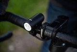 Ein am Lenker eines Fahrrades montierter Scheinwerfer mit Reflektor.