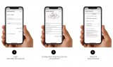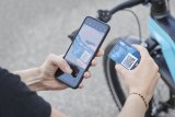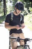 Ein Smartphone ist mittig auf dem Lenker eines Fahrrades montiert. Eine Person mit roter Jacke greift den Lenker.