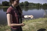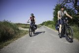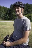 Eine Frau steht neben einem E-Bike auf einer Wiese. Auf der Schulter trägt sie ein Stativ, um den Hals hat sie ein Fernglas hängen und in der Hand einen Fahrradhelm.