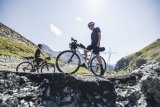 Zwei E-Mountainbikes lehnen an einer Metallwand.