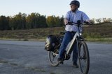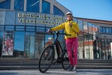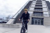 Ein Mann fährt auf einem gepflasterten Platz ein E-Bike.