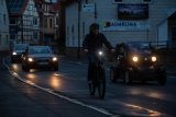 Ein Radfahrer fährt in der Dämmerung eine leere Straße zwischen Häusern entlang. Das Licht am Fahrrad leuchtet deutlich in die Kamera.