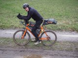 Eine Person hält ein schmutziges Fahrrad mit wasserdichten Taschen der Firma Ortlieb vor sich.
