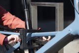 Detailaufnahme des Hinterbaus eines E-Bikes auf der Straße.