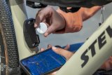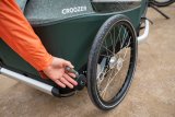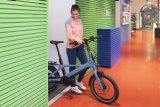 Eine Person fährt auf einem E-Bike über die Fahrbahnmarkierung einer Fahrradstraße.