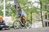 Eine Frau fährt auf einem E-Lastenrad mit Kinderanhänger quer über eine Straße. Im Hintergrund ist der Berliner Fernsehturm zu erkennen.