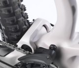 Eine Person fährt E-Mountainbike im Wald.