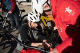 Ein Mann bremst sein E-Bike zwischen orangefarbenen Hütchen. Das Hinterrad hebt dabei vom Boden ab. Im Hintergrund schauen mehrere Personen zu.
