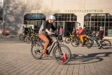 Ein Mann fährt auf einem gepflasterten Platz ein E-Bike.