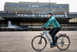 Eine Frau steht mit Fahrradhelm in der Hand an einem Gemüsestand auf einem Markt. Neben ihr steht ein E-Bike.