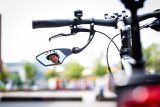 Eine Frau sitzt lächelnd hinter einem abgestellten E-Bike.