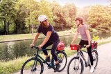 Eine Frau steht mit Fahrradhelm in der Hand an einem Gemüsestand auf einem Markt. Neben ihr steht ein E-Bike.
