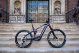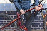 Eine Person wickelt eine Schutzhülle mit Klettverschluss um das Unterrohr und damit den Akku eines E-Bikes.