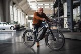 Ein Liegedreirad mit Handantrieb, einem großen Hinterrad und zwei kleineren Vorderrädern.