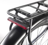 Eine Frau mit einem Rucksack fährt auf einem Fahrrad auf einem Radweg in der Stadt.