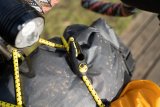 Der Lenker eines Gravelbikes mit Gepäck daran inmitten vertrockneten Farns.