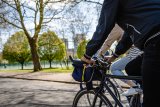 Hand greift mit Daumen oben an Lenker.