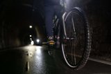 Ein Mann fährt in der Dämmerung mit dem Fahrrad auf einer Straße. Sehr deutlich zu sehen ist der leuchtende Frontscheinwerfer.