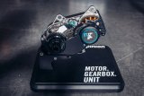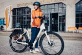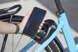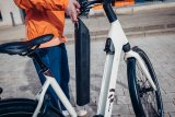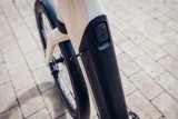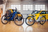 Frontscheinwerfer eines Lastenrades mit zwei kleinen orangenen Lichtern an den Seiten.
