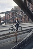 Eine Frau steht mit einem gelben Liegerad mit Versicherungskennzeichen am Gepäckträger vor der Skyline einer Großstadt.