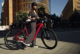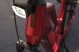 Eine Frau platziert den Akku eines E-Bikes im Rahmen.