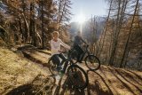 Zwei Frauen mit E-Bike stehen mit E-Bikes auf einem Radweg und lächeln einander zu.