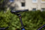 Eine Person misst die Sattelhöhe eines Fahrrades mit einem Maßband.
