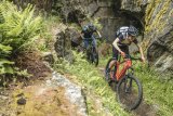 Zwei Personen auf E-Bikes in einer Gebirgslandschaft.