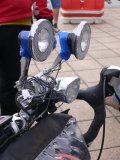 Frontscheinwerfer und Blinker an einem Liegedreirad.