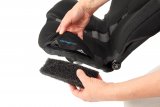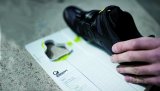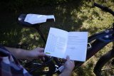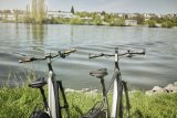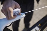 Ein Mann platziert eine kleine Wasserwage auf dem Sattel eines Fahrrads, um die Neigung zu überprüfen.