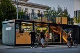 Ein Mann fährt auf einem E-Bike über eine Straßenkreuzung mit Straßenbahnschienen.