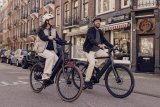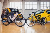 Eine Frau steht mit einem E-Bike vor einer Wand mit Graffiti und hantiert am Kinnriemen ihres Fahrradhelms.