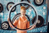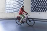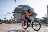 Eine Frau schiebt ein E-Bike über einen Gehweg vor einer Häuserzeile mit Geschäften.