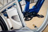 Eine Frau fährt auf einem blauen Lastenrad mit einem gelben Getränkekasten auf der Ladefläche über eine Brücke in der Stadt.