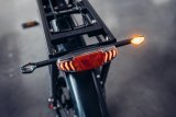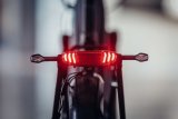 Am Gepäckträger eines Fahrrades leuchtet ein Bremslicht rot.