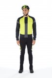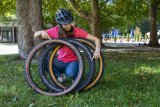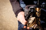 Die rechte Hand einer Person an einem Rennradlenker mit zwei Fingern am Bremshebel.