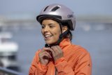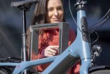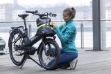 Eine Frau fährt auf einem E-Lastenrad mit Kinderanhänger quer über eine Straße. Im Hintergrund ist der Berliner Fernsehturm zu erkennen.