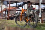 Ein Mann steht mit einem Fahrrad mit Bikepacking-Taschen auf einem Schotterweg in einer trockenen Gebirgslandschaft.